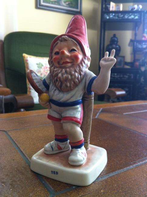 Why is this German tennis-playing-gnome named "Ted?" And why is he posing Asian-style? And WHY does my mother want to keep him?! Creepy...but 'collectible'...and a gift from a dear friend. So. Ted will make the move. (My conscience wouldn't allow me to 'disappear him'...)